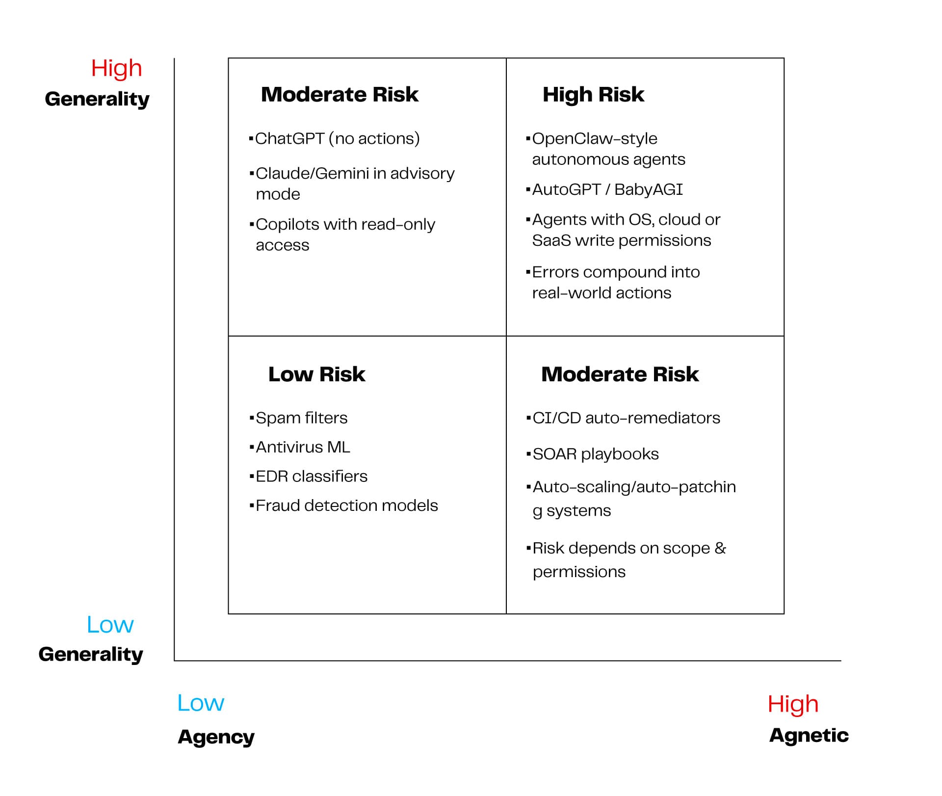- Low generality, low agency: risk is marginal and failure modes are bounded. This is where spam filters and antivirus classifiers live.